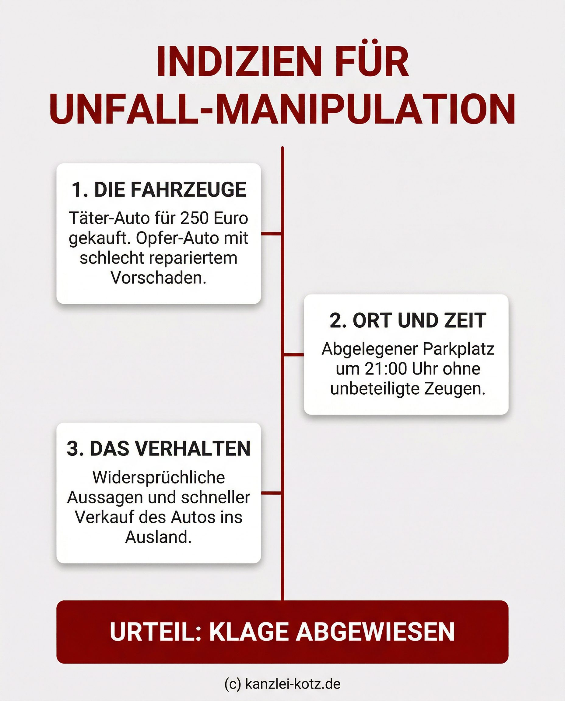 Da Versicherungen im Regelfall keinen direkten Einblick in geheime Absprachen haben, erfolgt der juristische Beweis durch eine ungewöhnliche Häufung von Indiztatsachen. Die Beweiswürdigung nimmt das Gericht dabei nach Paragraf 286 der Zivilprozessordnung (ZPO) durch eine umfassende Gesamtschau aller vorliegenden Umstände vor. Typische Merkmale für einen manipulierten Zusammenstoß sind oftmals die auffällige Kombination aus einem hochwertigen Opferfahrzeug und einem wertlosen Täterfahrzeug.